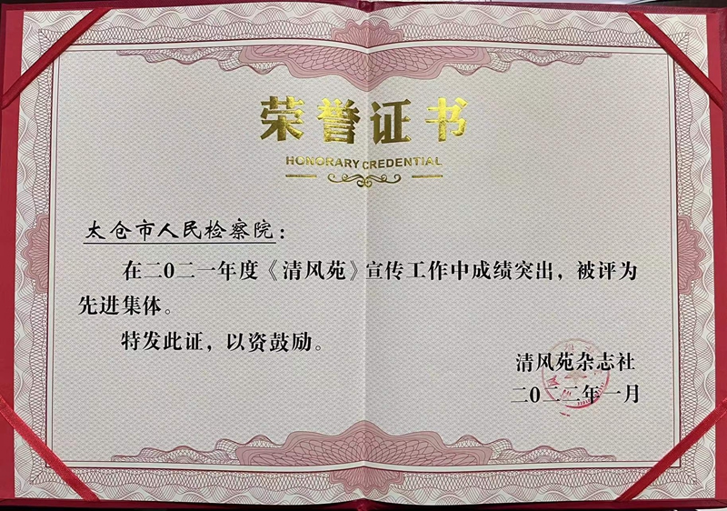 我院在2021年度《清风苑》宣传工作中成绩突出,被评为先进集体。吴玉洁同志被评为先进个人。