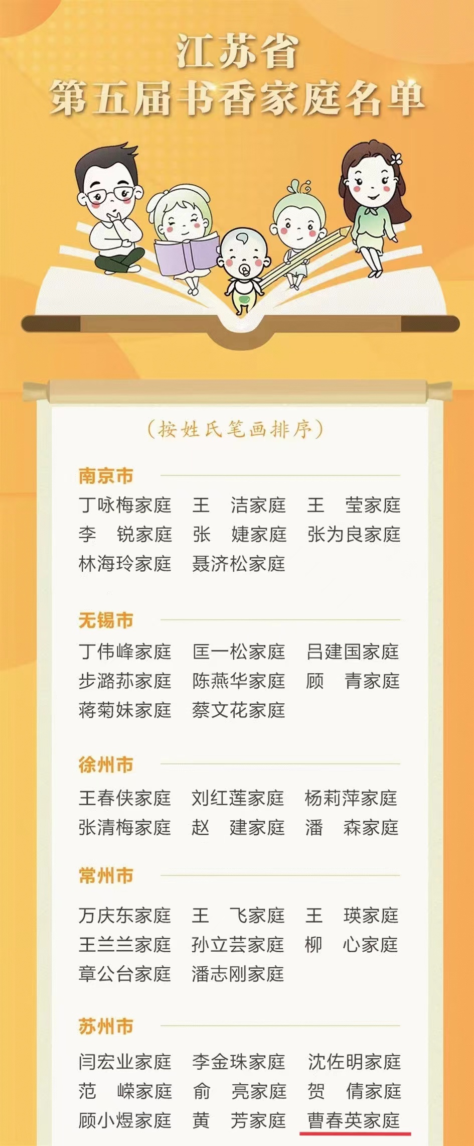 近日,江苏省妇联、省全民阅读办联合揭晓100户江苏省第五届“书香家庭”,其中我院曹春英家庭上榜。